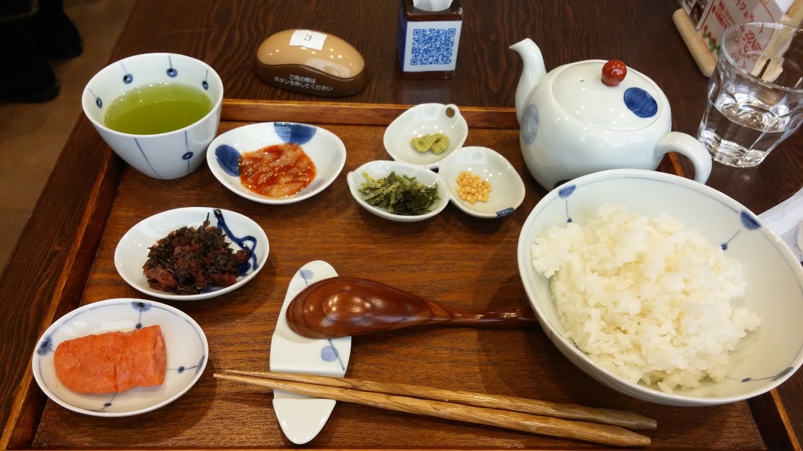 表參道上有不少特色店舖,雖然有不少都關門沒有營業,不得不提這裡還有一家很多特色的Starbucks,門面用木為素材,由建築大師隈研吾設計,成為表參道上一家別具風格的店。太宰府沒有太多餐廳,西鐵太宰府旁有家一蘭拉麵店,表參道上最有名的就是這家「味の明太子 ふくや」,店舖的前半是販售零售商品的地方,也有可以試食各種明太子商品,例如明太子醬,是當店的熱門商品。而商店後半就是餐廳,最著名的當然必食「明太子茶漬飯」吧,內容沒有太豐富,有幾種醃菜,有一種明太子,白飯和湯。明太子的味道就是咸咸腥腥的,不太懂欣賞。
