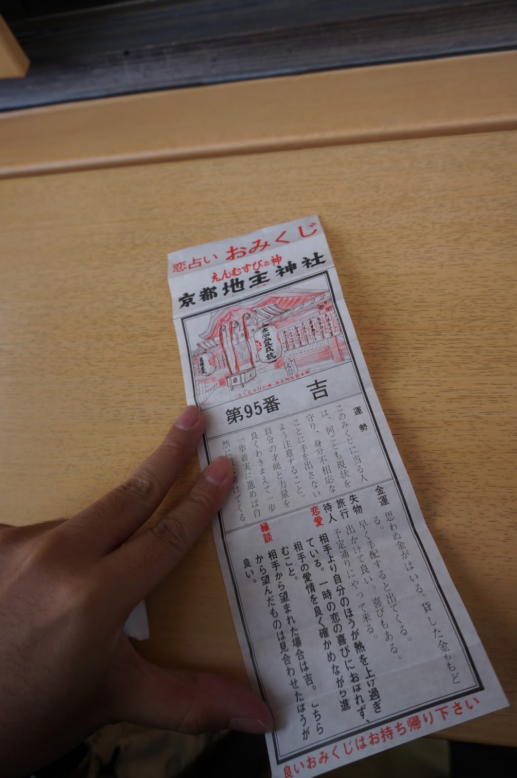 參拜 (參觀) 清水寺費用為 300yen,對清水寺真的沒有甚麼感覺,而且碰巧又遇上了修繕工程,來得好像不是時侯。遊人太多,影相太麻煩,所以都是順路繞了一圈就回來了。不過值得一提的「地主神社」,位於清水寺裡面,是祈求姻緣非常靈驗的地方,有興趣就必定要來「結緣」,我也求了一支籤文,95 號籤 (吉),內容不懂,求大神翻譯… (笑)!