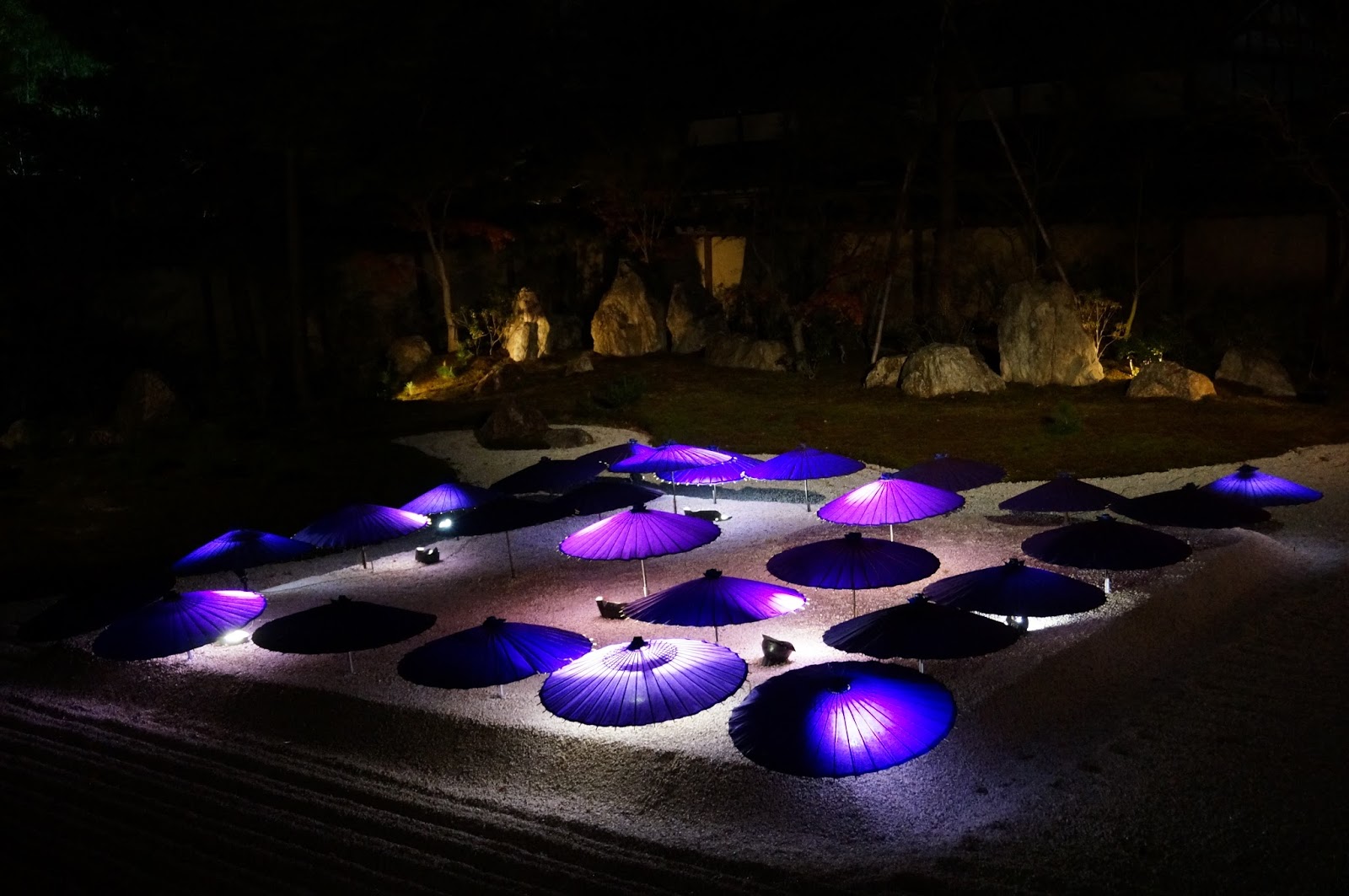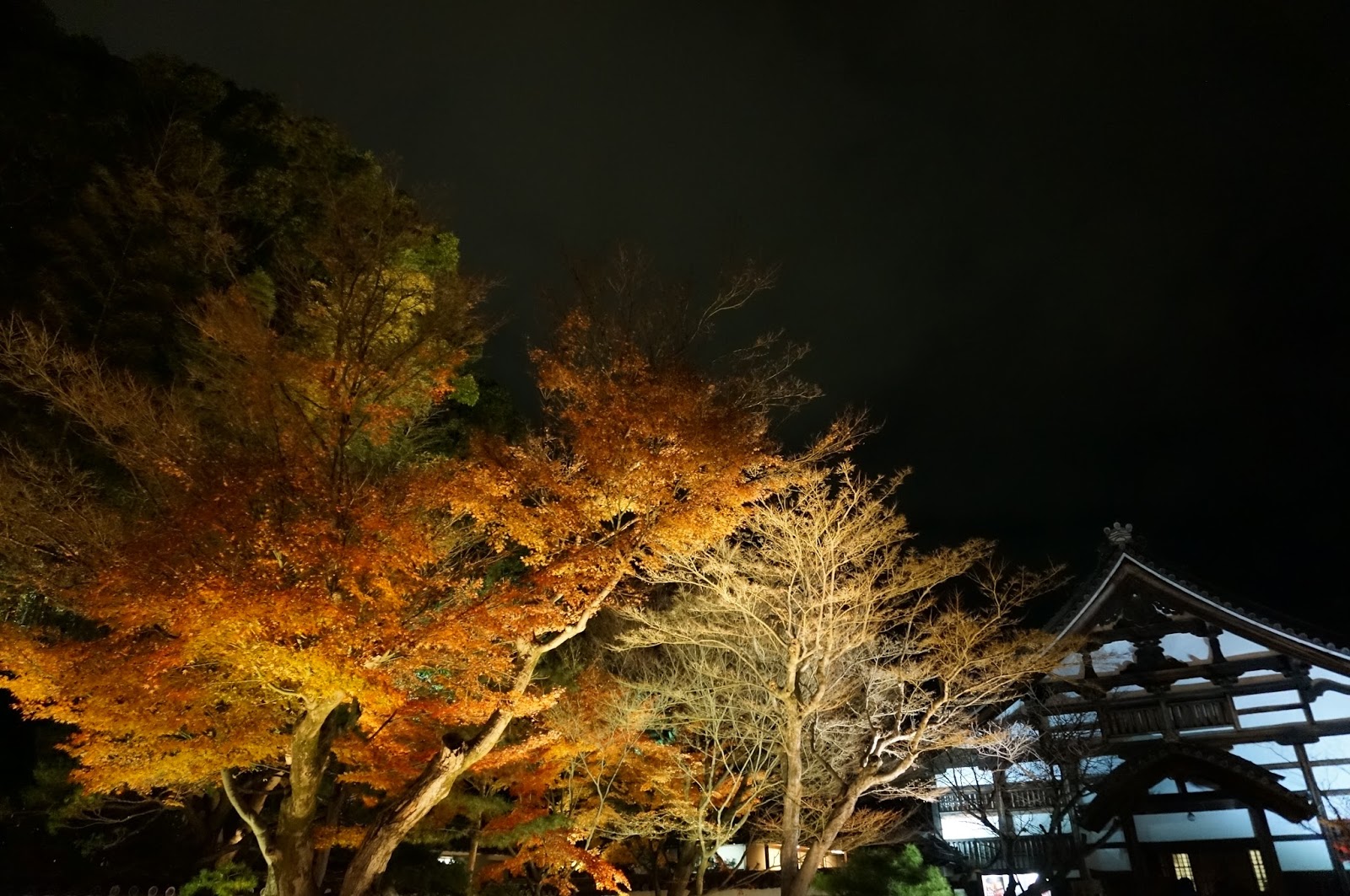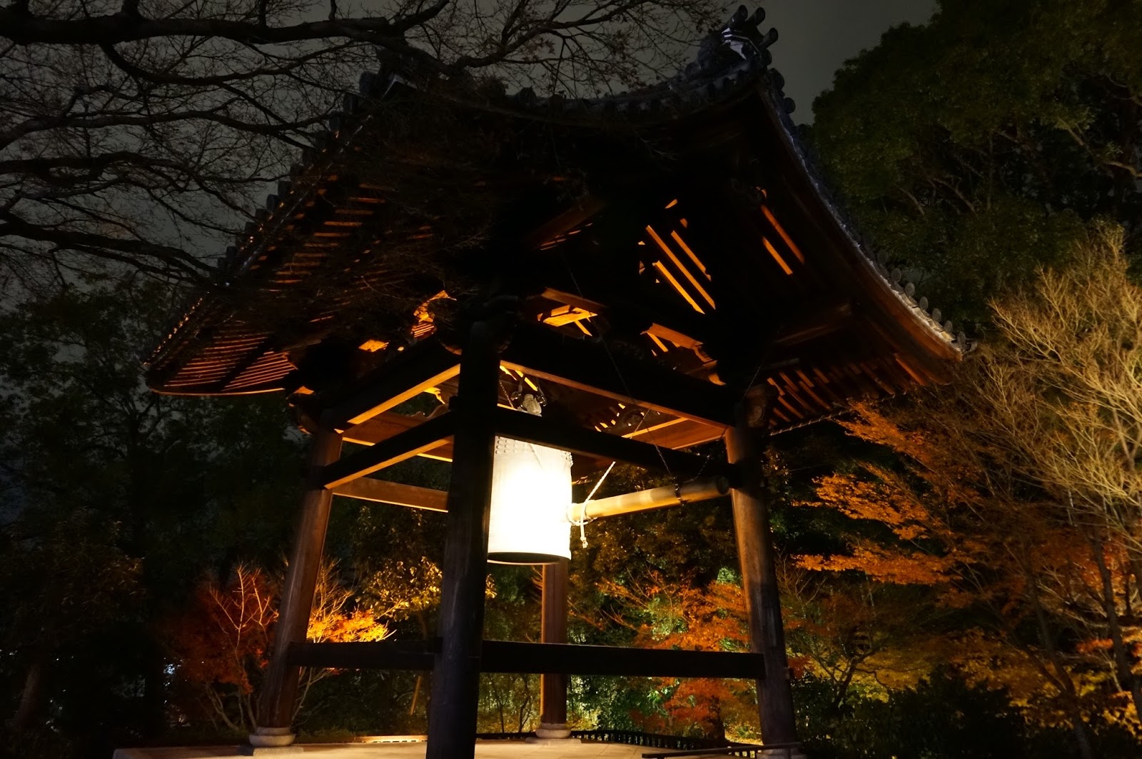 由「古裝人」換回「現代人」的服裝,終於可以掃街和買手信了,路經三年坂、二寧坂,滿滿都是食店、賣手工藝、手信的店鋪。之前都提過,京都冬天很早入黑,雖然只是 4 時許,但加上天陰,天色漸沉入黑,商店亦臨近關門時間,遊人漸漸散去,清水寺繁華的一天告一段落…不過旅人活動當然還未完,原來每年的 10-12 月,鄰近於二寧坂的「高台寺」,會特別舉行夜間參拜 (拝観) 活動 (門票 600yen),好像是稍高的價錢但覺得比清水寺更值得一去,因為漆黑的夜空下,用上不同顏色的燈光照射著樹木和建築物,營造出很特別的效果,無論是環境和氣氛,都變得更莊嚴,更有宿靜的氛圍,而且還有少許未落的楓葉,景色迷人。