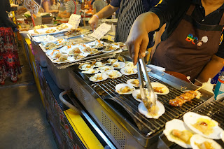 Asiatique the riverfont就像是一個個倉庫式設計,同一類別的店舖就會是同一個倉庫號碼的樣子。隨便走走看看買買,去到摩天輪之下就是美食區,美食區相當熱鬧,而且有好多各式各樣街頭小食,串燒啦、海鮮啦、炒粉啦等等。食飽後就再去逛街了,看中了一頂帽子和一個索繩袋,原來這裡的人都略懂用簡單英語溝通,不過在這裡買東西一定要講價(殺價),因為他們一定會開得比較高的價錢,記得要講價,講到自己可以接受的範圍才買吧。