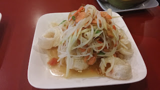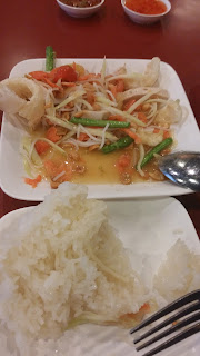 午餐就在Somtam Nua吃,這店人氣都不錯,而且曼谷都有多家分店,而我就去了Siam Square對面的這家,隔幾個舖位還有一家名氣都不錯的平價按摩店Siam Relax Thai Massage,不過這次就沒有試這家按摩店了。Somtam Nua並不難找啊,來到的時候也不用排隊,餐牌上有圖片有英文,不怕看不懂,看圖便懂點,而且價錢都不貴。泰式沙律有很多很多款,隨便點了一款,以及一個椰青,泰國的椰青真的是很清甜,又好喝。而這個泰式沙律酸酸辣辣的,但辣度其實都不低,愈吃愈辣。然後看見其他座上客都有叫一個黏飯(Sticky Rice),所以都點了一個,味道不錯。