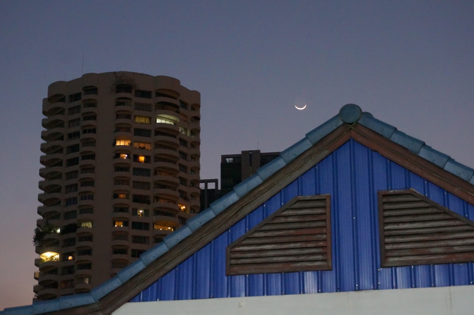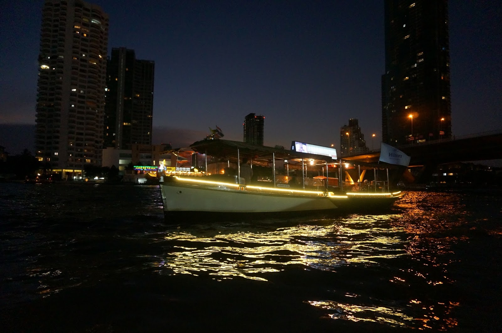 傍晚時候就轉移陣地了,往Asiatique the riverfont前進,這個是曼谷有名的河畔夜市,超多店舖、又有餐廳、街頭美食等,規模是非常大,裡面有海量的店舖,很容易會迷路。還有一座標誌性的摩天輪。而去Asiatique the riverfont是要坐接駁船前往,先搭BTS去Saphan Taksin,再步行5分鐘左右到了碼頭,看到長長的人龍就是了,等下等下愈來愈多人,原來一架船是可以載好多人的,多到好像快沉的樣子,而且船又開得快,所以都有點怕怕,船程大約是10分鐘以內就到了。如果時間剛好,可以襯著日落的時間來坐船,還可以欣賞到日落景色。