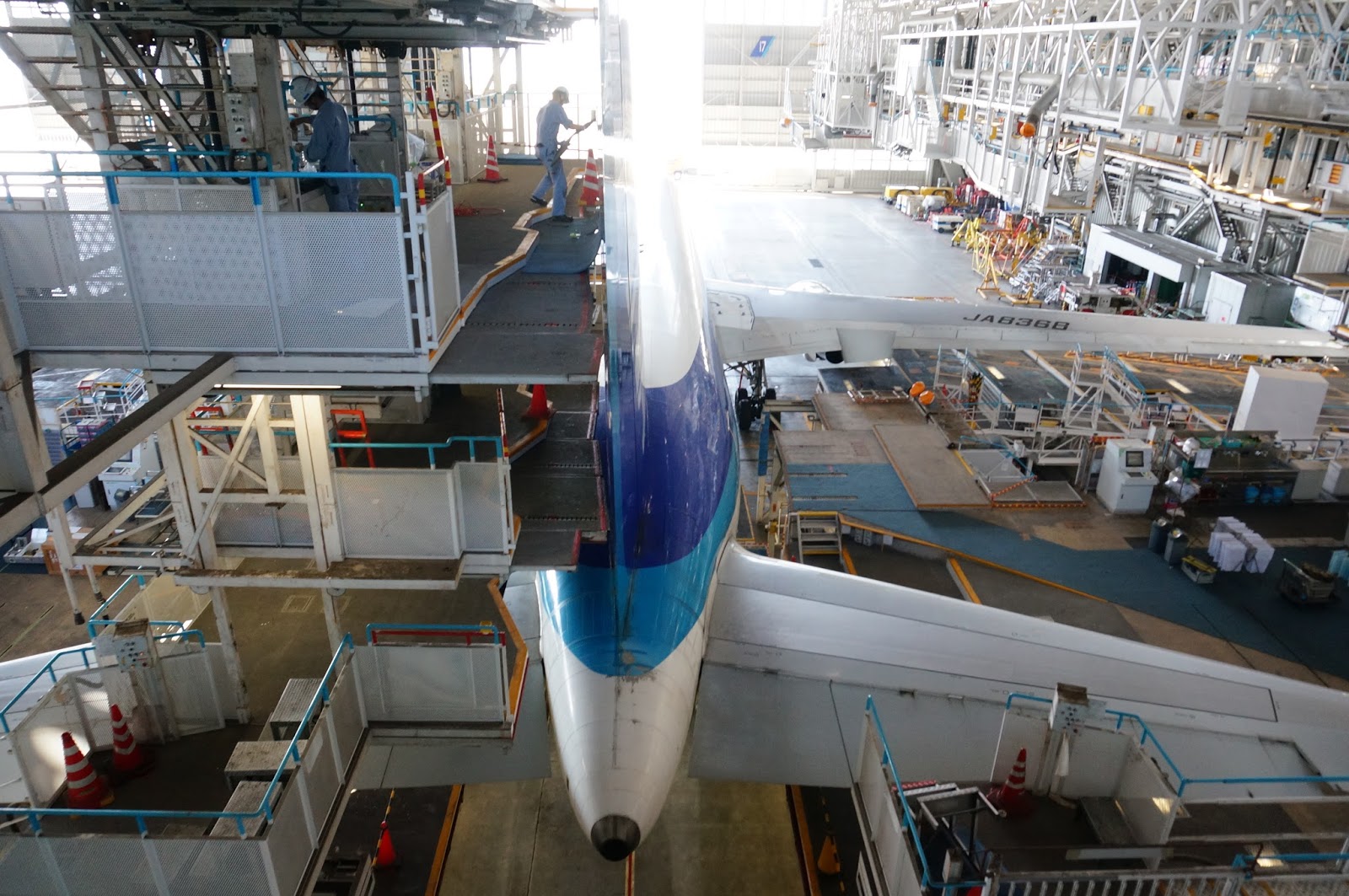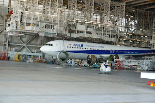 主持小姐會著大家看一段影片,關於ANA一班航機由準備到起飛,空中,各個崗位的日常運作,也挺有趣的。接著主持小姐會介紹一下羽田機場,講解一下飛機的知識等等,大家更有機會觸摸一些飛機零件。差不多大半小時過去後,就會讓大家準備好,講解注意事項,戴好安全帽,進入維修庫範圍了喔。終於可以近距離看飛機了,也會看到維修庫人員正在工作。維修庫的門有打開,所以也看到外面不是有飛機升降,本來以為只會在上層看看就算,原來看完上層後,會帶大家再走到下層,甚至走到機肚及機翼底下,平常坐飛機真的沒有可能有這樣的機會啊,參觀機庫的時間有半小時左右,有點看到不捨得走。見學完結後,大家便可以自行離開了,離開前也到了大堂的商店,買了不少周邊商品。